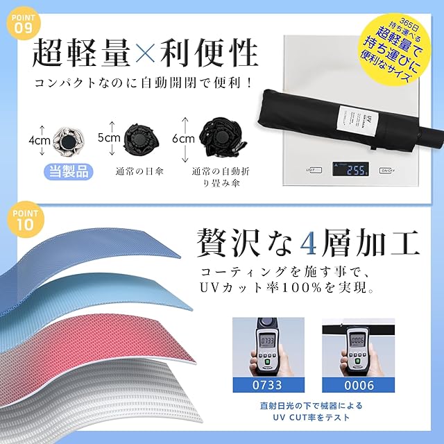 【晴雨兼用の高性能日傘】高密度高撥水テフロン加工が施されており、晴雨兼用で日傘としても雨傘としてもご利用いただけます。