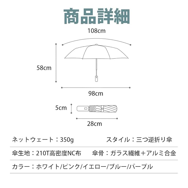 折り畳みサイズ:28*5*5cm ネットウェート:350g スタイル:三つ逆折り傘 傘生地:210T高密度NC布 傘骨生地:ガラス繊維+アルミ合金 カラー:ホワイト/ピンク/イエロー/ブルー/パープル