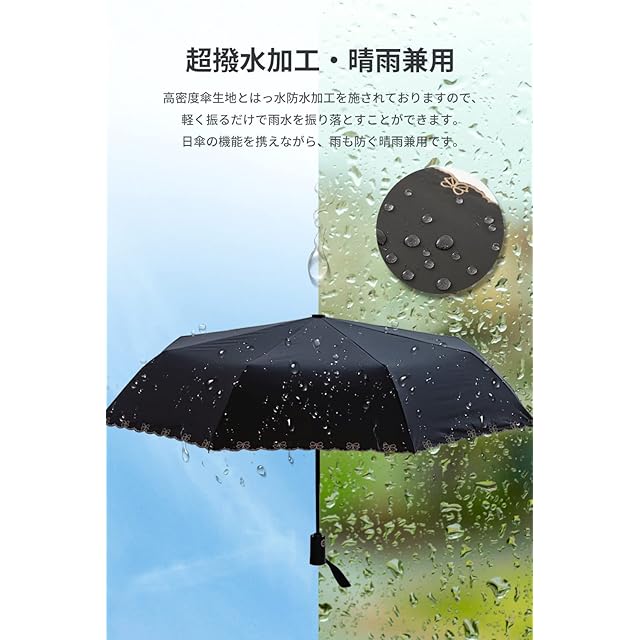 【晴雨兼用・優れた撥水性】210Tの高密度NC布を使用し、耐水性にも優れ、軽く振るだけで雨水を振り落とすことができます。はっ水防水加工を施されておりますので、長期間使用しても、雨の浸み込みが気にならなくなります。日傘の機能を携えながら、雨も防ぐ晴雨兼用です。