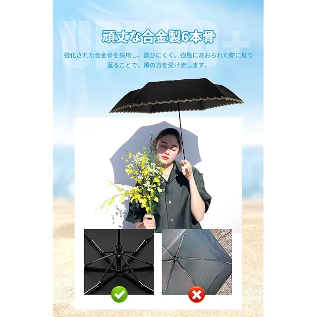 ✦【頑丈な6本骨の構造】頑丈なアルミ合金とグラスファイバーで作られた6本骨傘なので、鉄骨傘より大変軽量です 耐強風の折りたたみ傘です 。強度と柔軟性を備えた強化グラスファイバーは強風時、たとえ傘が逆に反り返っても折れることなく元の形状に戻ります。