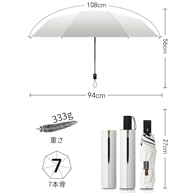 【携帯便利&男女兼用】7骨設計の折り畳み日傘で、重量が333g、傘面の曲面長さが108cm、開く直径が94cm、折りたたんだ長さは27cmです。折りたたみ傘は常にかばんの中に入れておいて持ち歩くのも可能です。通学、通勤、遠足、旅行、出張などの場合がご利用できます。さらに、シンプルなデザイン「外側白・裏側黒」が特徴的で、男性でも使いやすいです。