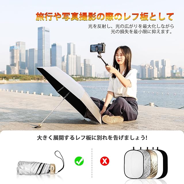 【反射傘&折り畳み日傘】旅行や写真撮影の際の反射用として使用でき、晴雨兼用の機能も備えています。