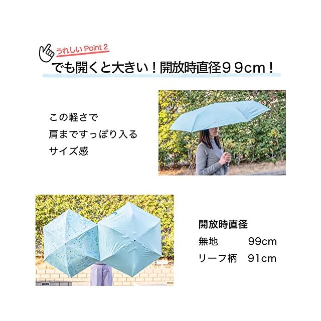 ・収納時サイズ、25.5cm×5cm×5cm、親骨:48.5cm×6本、開放時直径:91cm、重量:210~245g