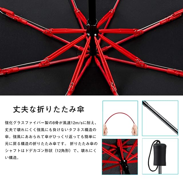 【頑丈&軽量 】頑丈で耐久性のあるグラスファイバー製傘骨を8本使用、260g軽くて丈夫で持ちやすい、傘の命ともいえる親骨には錆びない、よくしなる、おれにくいなどメリットいっばいのガラス繊維素材グラスファイバーを骨組みに使用して、軽量化と丈夫さを追求しました。強い風でびっくり返っても、骨が曲がることなく、すぐ元通りになります。
