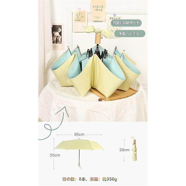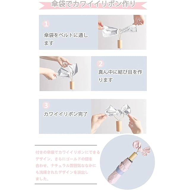 ☔【温かみのある木製ハンドル・カワイイリボンにできる傘袋付き】付きの傘袋でカワイイリボンにできるデザイン、さらにゴールドの紐を合わせ、ナチュラル雰囲気ななかにも洗練されたデザインを演出しました。男女兼用大きいサイズで、傘を広げると直径95cmとワイドサイズになり、顔周りや肩まで覆い、スッキリした無地デザインにより、女性はもちろん、男性も違和感なく使えます。