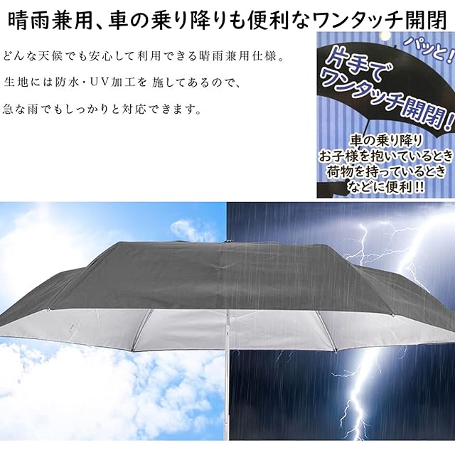 サイズ:親骨58cm、 機構:ワンタッチ自動開閉、 生地:ポリエステル 撥水 耐熱 UVカット(内側UVコーティング加工 ・UVカット99.9% ・UPF50+・1級遮光 )、
