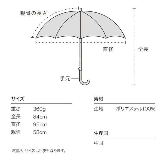 【晴れの日も使える雨傘(晴雨兼用)】 この製品は雨傘としてお使い頂くことを主としていますが、紫外線防止効果があります。 但し、色の濃淡によって紫外線遮蔽率(UVカット率)が異なります。次の数値を目安としてご参照ください。 淡色:約80%、濃色:約90%