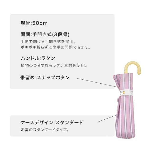 一見シンプルながらもデザイン性があるストライプ柄の雨傘。 シンプルながらも華があり、幅広い年代の方にお使いいただけます。 持ち手は温もりを感じられるラタン素材です。