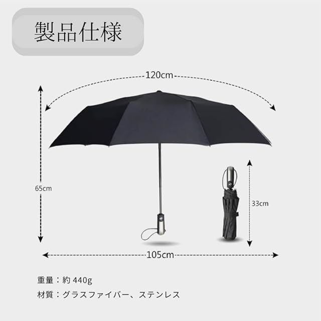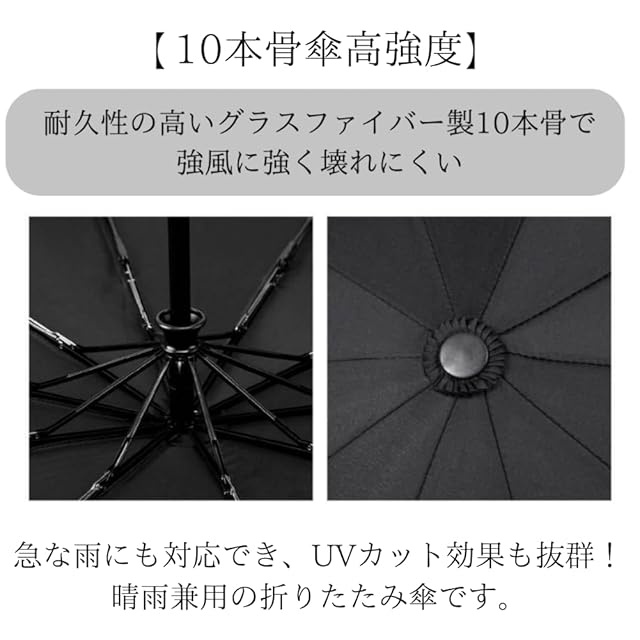 【10本傘骨高強度】耐久性の高いグラスファイバー製10本骨で強風に強く壊れにくく、アルミニウム合金製の傘より優れた耐風性を持ってます。錆びにくく、しっかりした骨組みにより丈夫で壊れにくい耐風傘です。普通の折り畳み傘より風に強い設計で、強風や豪雨にも安心できます。優れた日傘としてだけではなく、梅雨対策や、急な雨にも対応できる晴雨兼用の折りたたみ傘です。重量は430gで、折り畳むとたった32cmです。収納ポーチも付いていて、通勤通学や旅行でカバンに常備しておけるので、急な雨でも安心に使用できます。
