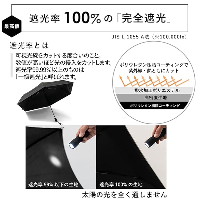 【高い素材品質基準】 検査機関で紫外線遮蔽率指数基準を満たす傘生地を使用し、 遮光率100%、UVカット(紫外線遮蔽率)99.9%以上と高い効果を保証します。