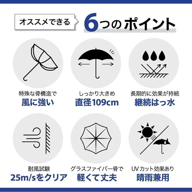 【特殊な骨の構造で耐風25m/sを実現】 風の抵抗により、最も折れやすい親骨と受け骨のジョイント部分にZ型のパーツを使用。 強風を受けたときにあてて反り返る仕様で、風の衝撃を逃します。 骨の材質はしなって折れにくいグラスファイバーを使用し、耐久性にも優れています。