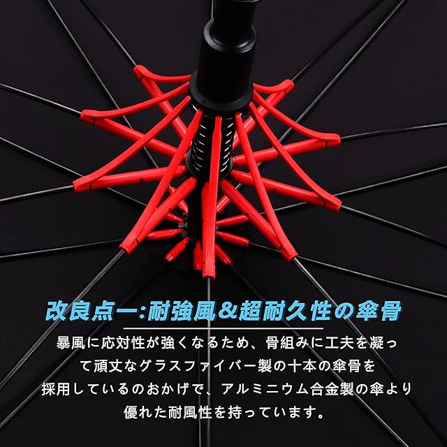 【頑丈な10本骨構造】暴風に応対性が強くなるため、骨組みに工夫を凝って頑丈なグラスファイバー製の十本の傘骨を採用しているのおかげで、アルミニウム合金製の傘より優れた耐風性を持っています。強い風でひっくり返っても、開閉スイッチを押したら、骨が曲がることなく、すぐ元通りになります。