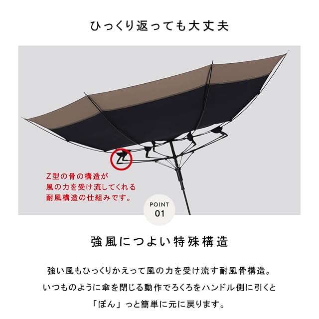 【強風でも安心の耐風設計】 風に強い耐風構造骨を採用しているので、風で傘が逆さになってしまっても いつものように傘を閉じる動作でかんたんに元通り。