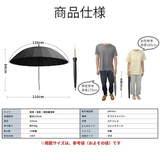 収納時 : (約)長さ84cm 使用時 : (約)直径110cm 、弧の長さは128cm、重量:(約)545g、UPF40+ 、収納ポーチ付き。カラー:グレー、ブラック。