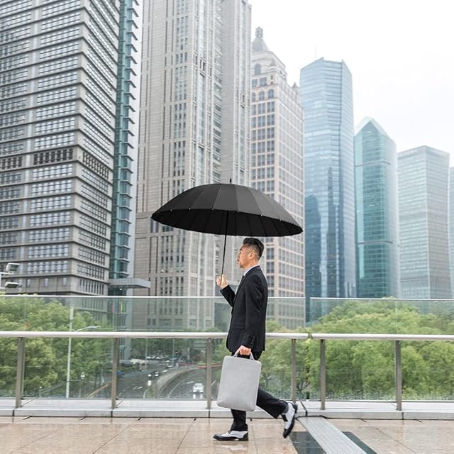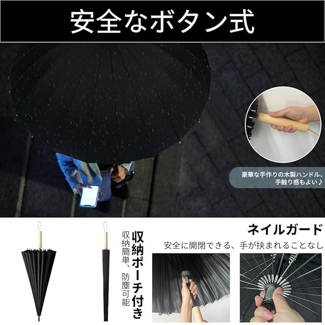 【耐風傘 24本骨 強風対策】傘骨は全体で高強度グラスファイバーで作られて、頑丈、耐久性などの特徴を持ちます。通常の長傘より、24本の傘骨まで増やし、空気力学に基づいて風を受け流す構造で設計されているので、強い風でびっくり返っても元に戻ります。