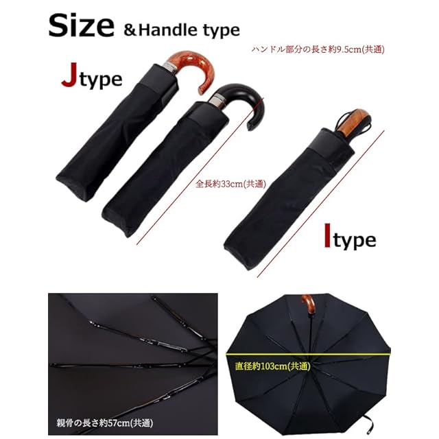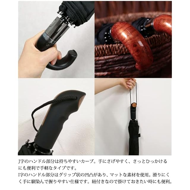 おしゃれで落ち着いたデザインは幅広いシーンで活躍。「タイプ1(木目調がポイントのJ字型)」「タイプ2(レザー調がポイントのJ字型)」「タイプ3(木目調がポイントのI字型)」と、ハンドルは3タイプをご用意。生地は全てシンプルな無地のブラックですので、ビジネス用、冠婚葬祭用にも1本あると便利です。