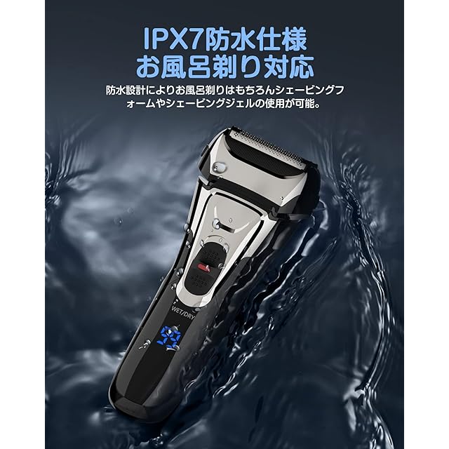 【お風呂剃り&ウェット/ドライ対応】電動シェーバーがIPX7基準「※1」の完全防水設計なので、快適なドライ剃りはもちろん、ジェルや泡剃りにも対応、肌への負担を軽減しながら使用できます。(※1 IPX7基準:水深1メートルに30分間水に浸けても有害な影響を生じる量の水の浸入がない)