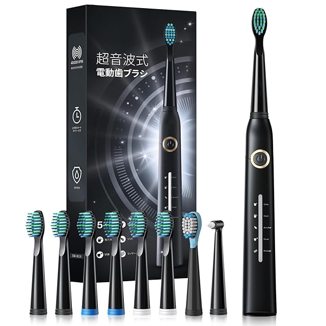 音波電動歯ブラシ、8ブラシヘッド付き電動歯ブラシ、40,000VPM 5モード、音波歯ブラシクイックチャージ4時間持続30日、電動歯ブラシブラック