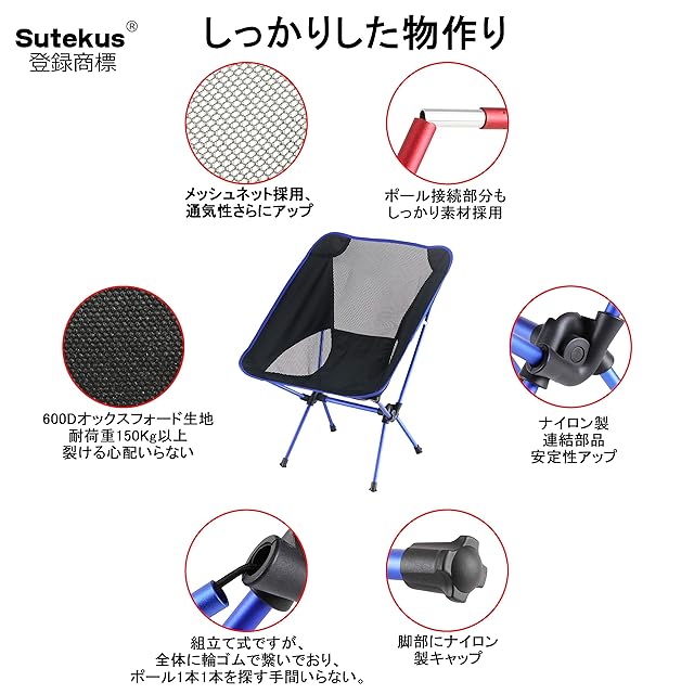 【頑丈】肉厚1.5mmのアルミニウム合金パイプ及び600Dオックスフォード生地、ナイロン製連結部品を採用、耐荷重150Kg、若干太くても安心に座れるチェアでございます。