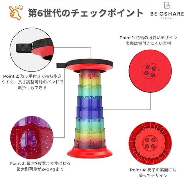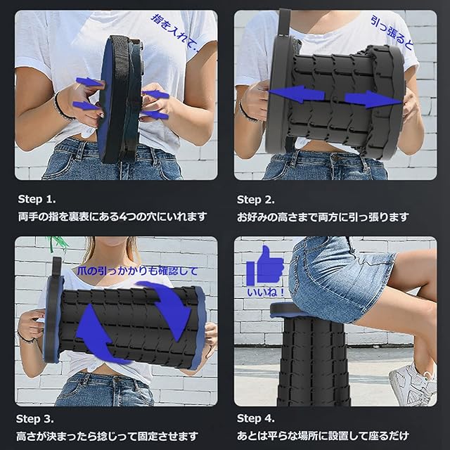 【簡単な使い方/持ち運び便利】:指をスツール両辺の4つの穴に挿して、ひねりながら伸ばして、好きな高度に引いて回転して固定します。逆方法に少しひねりを入れながらスツールの両端を押すだけで一瞬で収納可能です。女性の方は手で開けるのがキツい場合、足で椅子の底部を押さえながら、手で頂部を引っ張ると、より安く開けられます。重さは0.97Kg、収納サイズは9cm*25cm、取っ手、バンド付き、楽に持ち運びできます。もちろん、リュックに入れても平気に持ち運びできます。ショルダータイプに持ち運ぶ時は、チェアの側に回るロップがあるので肩にかけ持ち運べるから本当に便利です。
