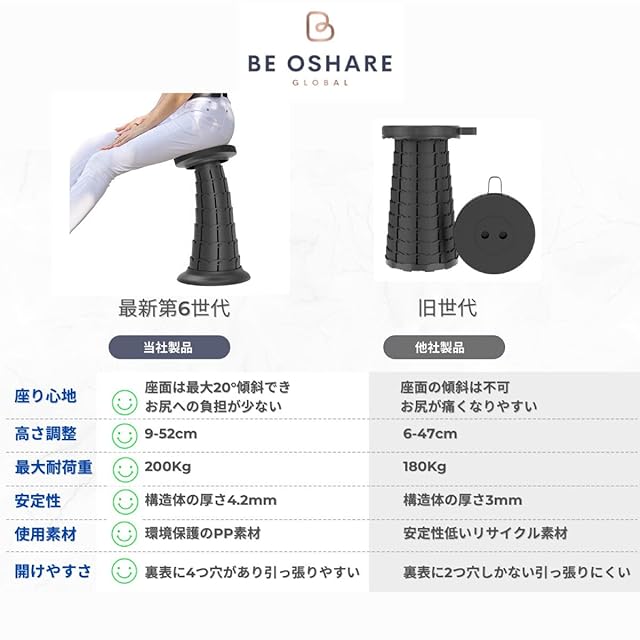 【耐荷重200kgで丈夫 】:頑丈尚且つ環境保護PP素材を採用しておりますので、耐久性が高い、さびを気にする必要はありません。ほかのABS製と違って最大耐荷重が200Kgまで実現。7段階(9~52cm)の高さ調整が可能で、椅子の足となる構造体は従来品より約1.2mm厚くなりますので、安定性が高くなります。