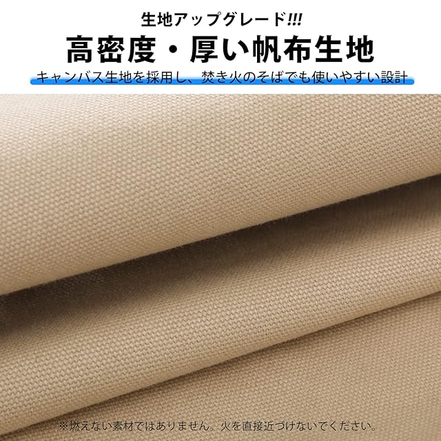 【生地強度UP!】このアウトドアチェアは高密度・厚い帆布素材(100%コットン)を採用し、火の粉が飛んでも燃えにくい素材なので、焚き火チェアとして使用しても大丈夫、耐久性にも優れています。