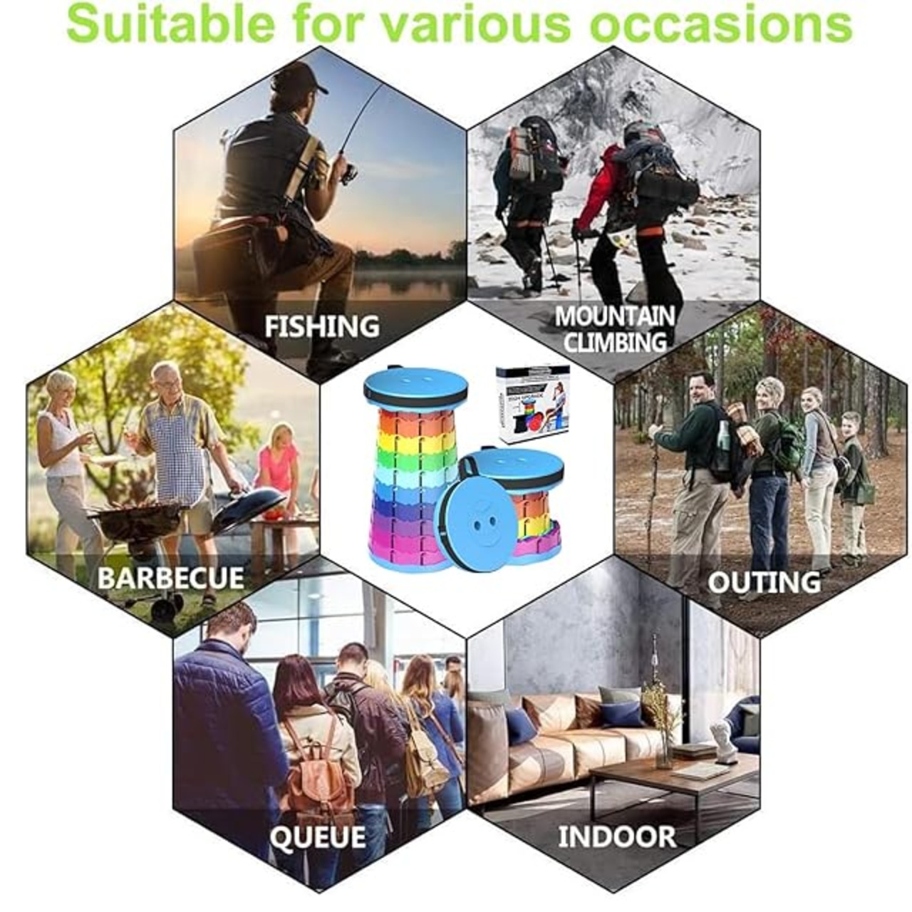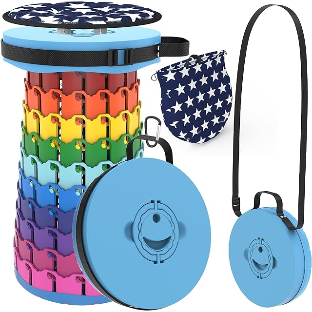 『高さ調節も自由自在折り畳みスツール』 セット内容:折りたたみスツール本体x1、星柄収納バッグx1、360度回転クッション、カラビナx1 最新第5世代折りたたみ椅子、より軽量化、より頑丈、より高い耐久性!