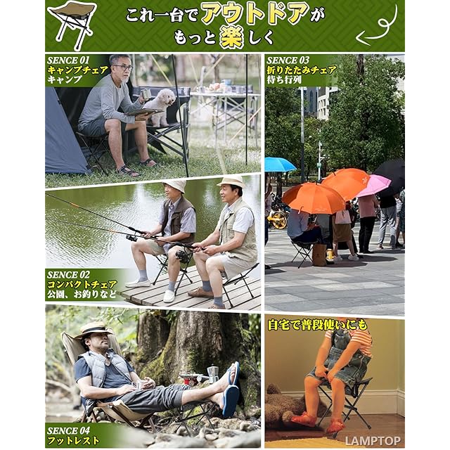 LAMPTOPアウトドアチェア コンパクト椅子 高さ34cm 超軽量520g【日本語説明書付】折りたたみ椅子 キャンプチェア お釣り お花見 待ち行列 収納袋付(カーキ)