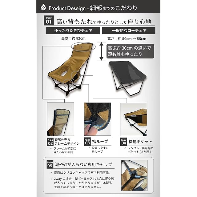 <ロースタイル専用設計> 高さ調整できる2 wayスタイルのチェアの場合、ロースタイルで使用するとどうしてもレッグポールの穴に砂や石がはいってしまいますが、本製品はロースタイル専用設計であり、そういった心配もありません。また脚部はシリコン素材を採用し、室内でも使用可能です。