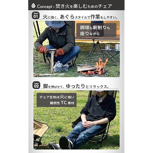 <ハイバック・ロースタイルでリラックス> BOKKURYのゆったりたきびチェアはハイバック・ロースタイルのキャンプ用チェアです。ロースタイルの為、焚き火をする際のバトニングや調理などの作業もし易い設計となっています。また一般的なアウトドアチェアは背面が低い為、頭や首をチェアにあずけることができませんが、本製品はハイバック設計の為、頭や首も預けてリラックスして使用頂けます。