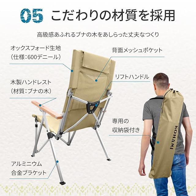 KOHAMI アウトドアチェア デッキチェア 折り畳み 4段階リクライニング 枕 背面ポケット 軽量 (ベージュ)