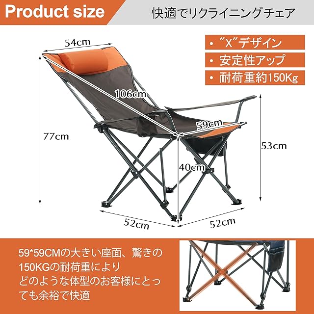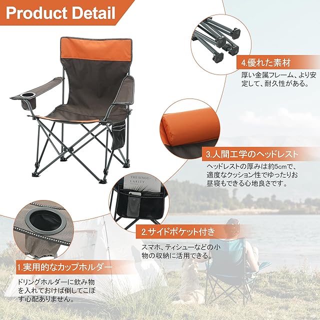 【人間工学デザイン&耐荷重】 背もたれは人間工学に基づいて、頭、臀部、背中を支えるように設計されており、横になっているときに余暇を楽しむことができます。 製品の耐荷重性能は高水準でテストされ、145kgの耐荷重確保されています。どんな状況においても、信頼性と安心感を持って使えるアウトドア椅子です。