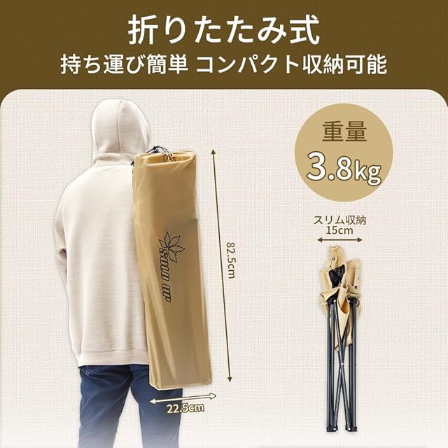 【収納後】幅22.5x奥行15x高さ82.5cm。収納袋付きですので、持ち運びが便利です。軽量なスチールを使用した為、本体重量は3.8kg未満、荷物運びの負担を大幅に軽減できます。