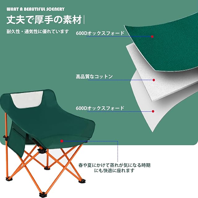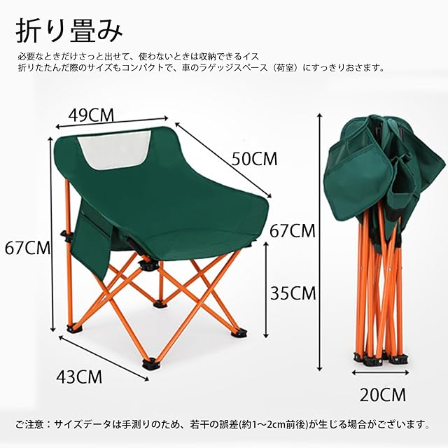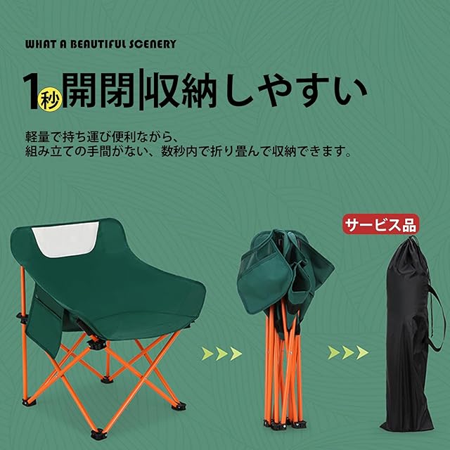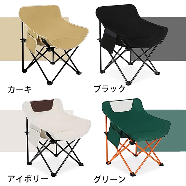 【利便性が高い】軽量で持ち運び便利ながら、組み立ての手間がない、数秒内で折り畳んで収納できます。折りたたんだ際のサイズもコンパクトで、車のラゲッジスペース(荷室)にすっきりおさます。機能面では、サイドポケットを備えていたので、小物の収納に便利です。ロットにより、一部のチェアはバックポケットを装備されますが、チェア全体の耐久性に影響を与えませんので、ご安心ください。
