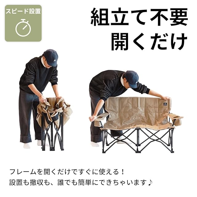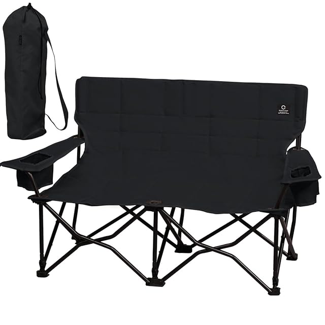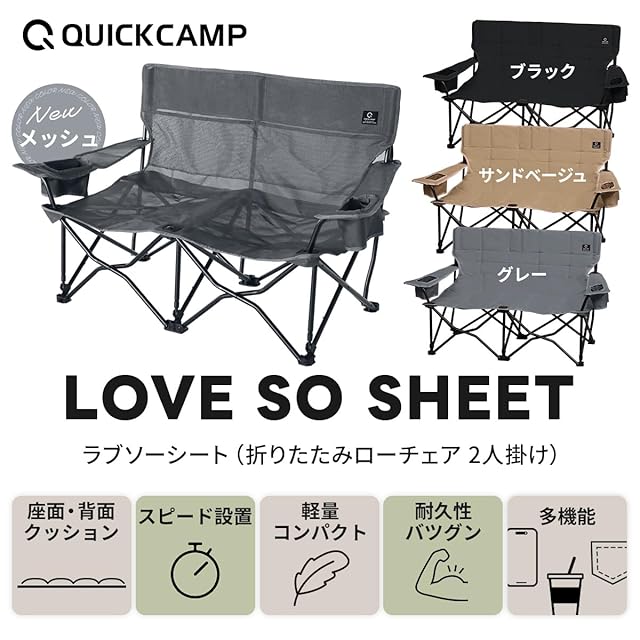 [クイックキャンプ] 収束式ベンチ 二人掛け 椅子 イス チェア ベンチ コンパクト ドリンクホルダー付き ピクニック バーベキュー 屋外 ベランダ ブラック ラブソーシート