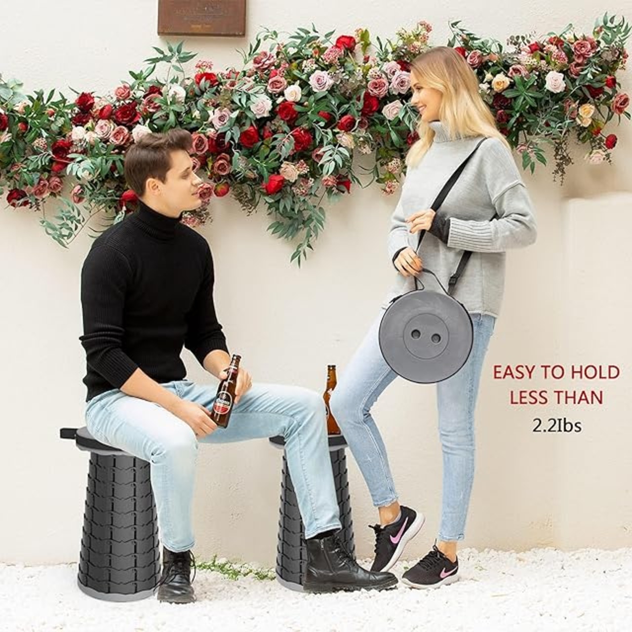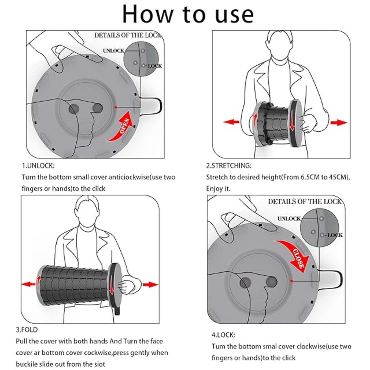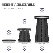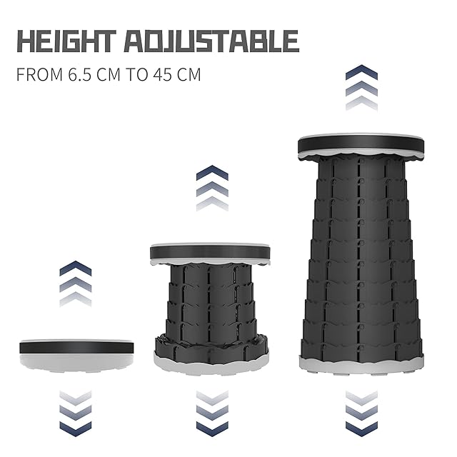 【楽々収納&簡単に折りたためる】 重さは1Kgぐらい、収納サイズは6.5cm*25cm,取っ手、ストラップ付き、楽に持ち運びできます。もちろん、リュックに入れても平気に持ち運びできます。 指をスツール両辺の小孔に挿して、ひねりながら伸ばして、好きな高度に引いて回転して固定します。逆方法に少しひねりを入れながらスツールの両端を押すだけで一瞬で収納可能です。