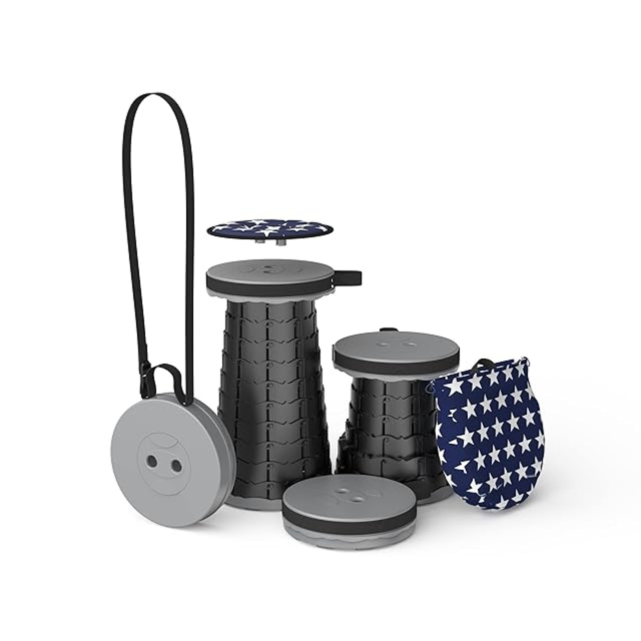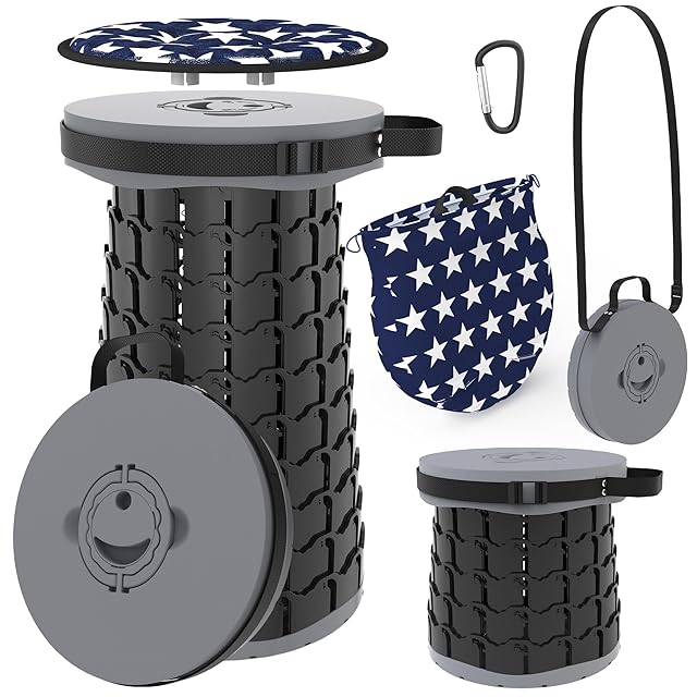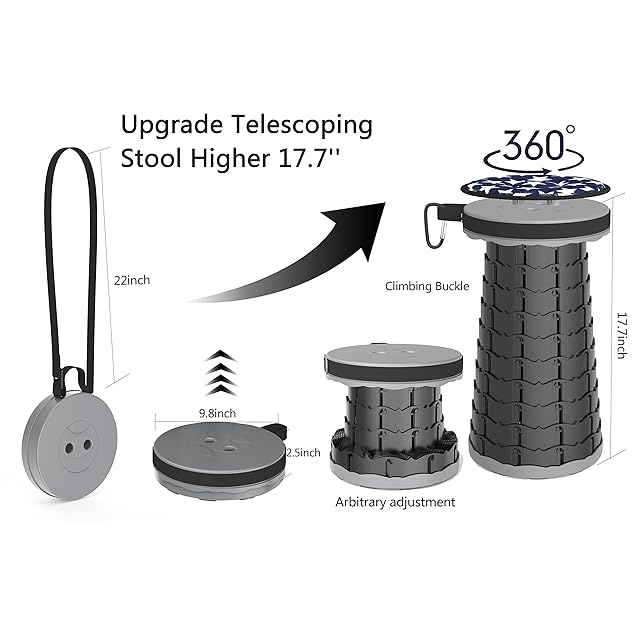 【高さ調節も自由自在折り畳みスツール 】 セット内容:折りたたみスツール本体x1、星柄収納バッグx1、360度回転クッション、カラビナx1 最新第5世代折りたたみ椅子、より軽量化、より頑丈、より高い耐久性!