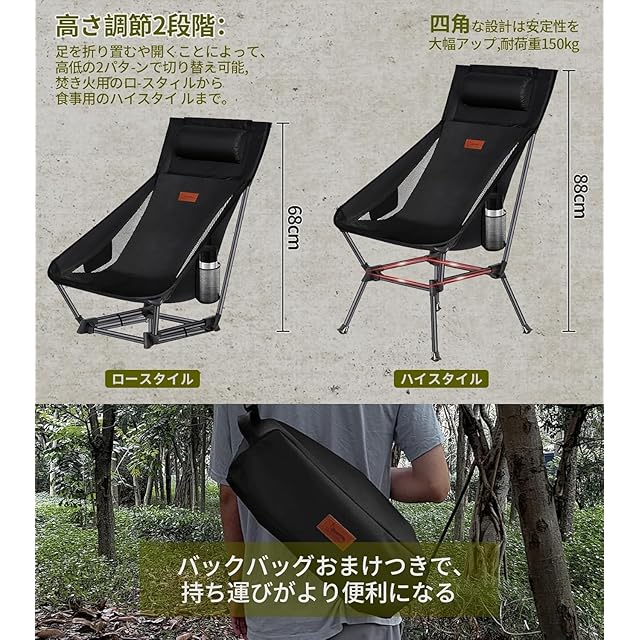 【高さ両パターンで切り替え可能】足を折り畳むや開くことによって、グランドとノーマルスタイルの両パターンで切り替え可能。焚き火に近づき暖まることや、足を伸ばすことができ、より多くのシーンで大活躍!【四角形フレームでより安定】伝統的なキャンプ椅子と違い、座面の下のフレームは四角形となっていて、全体的に安定性がアップグレード!