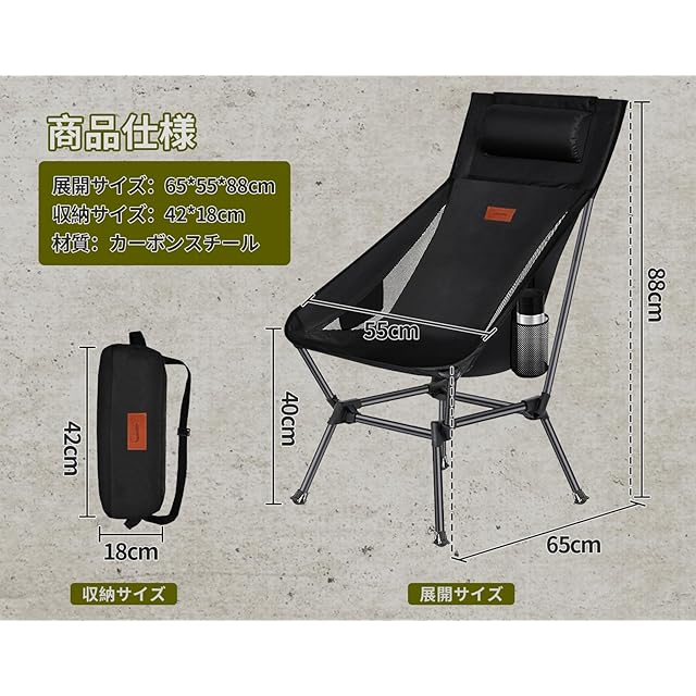 【優れる耐久性と通気性】 アウトドア椅子は800Dポリエステルを採用した座面とメッシュの設計で、あつい季節も蒸し暑くなく、抜群の通気性と快適な座り心地を確保できます。座面の裏も防水加工し、雨でもタオルでちょっと拭くだけ座れます。さらに、座面を深くするし、ハンモックのように体にフィットし、ゆったりと包み込まれる座り心地を実現したレジャーチェアです。