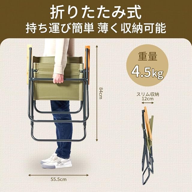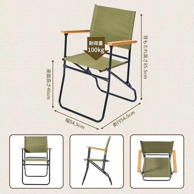 【商品仕様】 ・材質:スチールフレーム、竹集成材(ひじ掛け)、ポリエステル生地(座面) ・サイズ(展開時):幅約54.5cm × 奥行き約54.5cm × 高さ約85.5cm ・重量:約4.5kg ・耐荷重:100kg