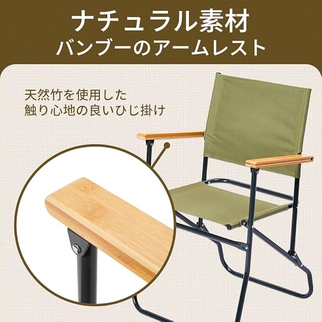 【スタイリッシュで機能的なデザイン】 こちらの折りたたみチェアは、シンプルながらもおしゃれなデザインが特徴です。ブラック・オリーブグリーン・ベージュの3色展開からお選びいただけます。竹集成材を使用したナチュラルなひじ掛けは、アウトドアからインテリアまで幅広いシーンで高級感を演出します。