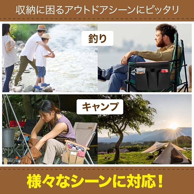 【簡単取り付け】椅子の肘掛けに被せてボタンで止めるだけ!ワンタッチでらくらく設置できます。折り畳み可能で軽量のため、ソロキャンプでの移動や持ち運びにも便利です。