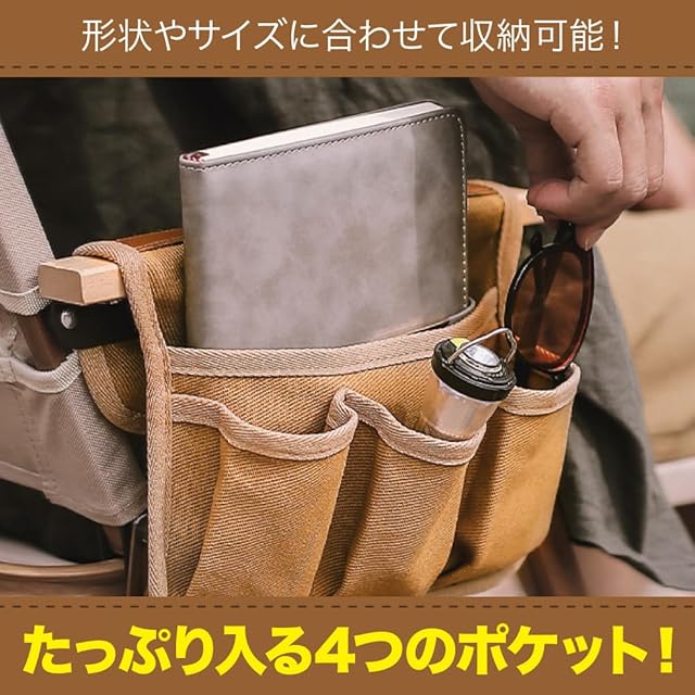 【アウトドアでも快適に】メインポケット1つとサブポケット3つがあり、飲み物やメガネ、本、スマホなどが収納可能です。取り出しも簡単で、水や汚れにも強いのでアウトドアシーンに最適です。