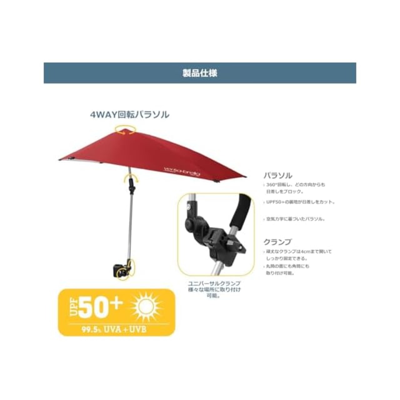 どこでも使える:椅子、観覧席、ゴルフバッグ、ベビーカーなど、ほとんどの場所にクリップできるユニバーサルクランプを備えたこの傘は、どこにいても日差しから守ることができるシンプルで効果的な方法です。クリップオンなので、ビーチやゴルフ、スポーツ観戦など、さまざまなシーンで活躍します。