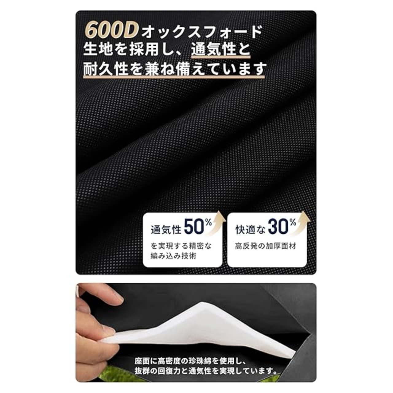 【生地が通気性で丈夫】600Dオックスフォード生地を使用し、通気性が高く裂けにくく、ダブルステッチにより背もたれ両サイドが裂けない丈夫な構造です。長期間使用できます。