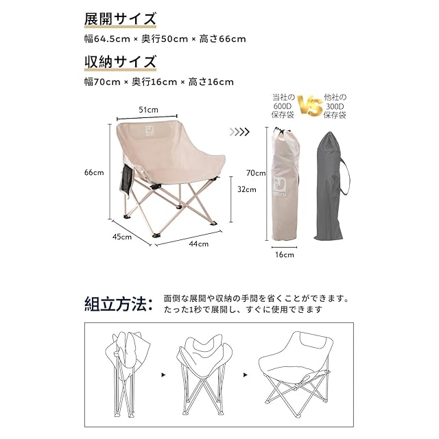 【10秒で設置・折りたたみ】aruruキャンプチェアはデザイン特許を持っています。背もたれの枠組みを持ち上げるだけで折りたたみ収納できます。収納時はコンパクトな棒状になり、サイズは約20cm20cm90cmです。収納袋が付属しています。重量はとても軽く、たった4kgです。外出時に持ち運びが便利です。