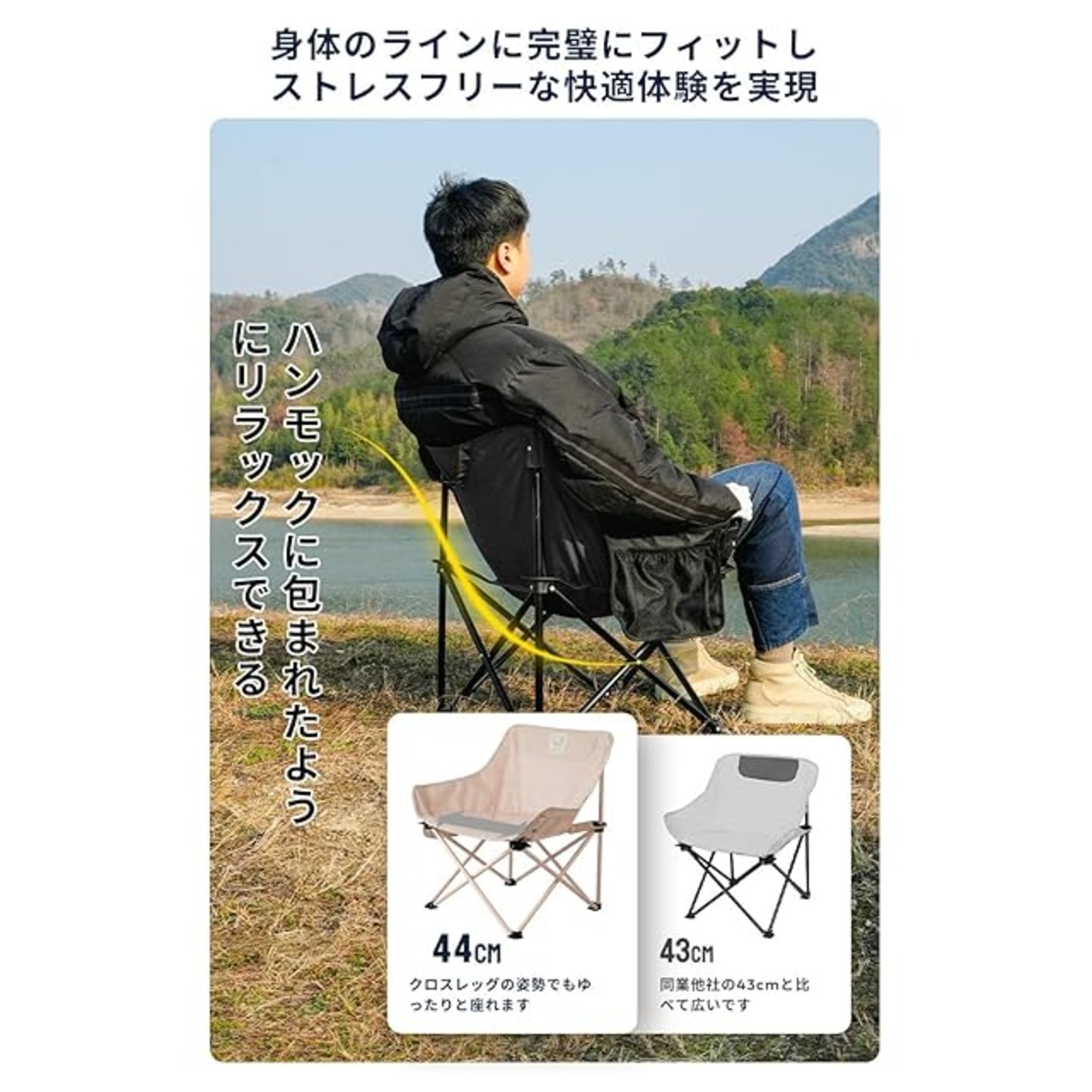【着席が快適】人体工学的なデザインで、ハンモックに包まれるようにリラックスでき、背中や腰の圧迫を効果的に緩和できます。座面にはパールコットンを使用し、屋外でも快適な休憩ができます。