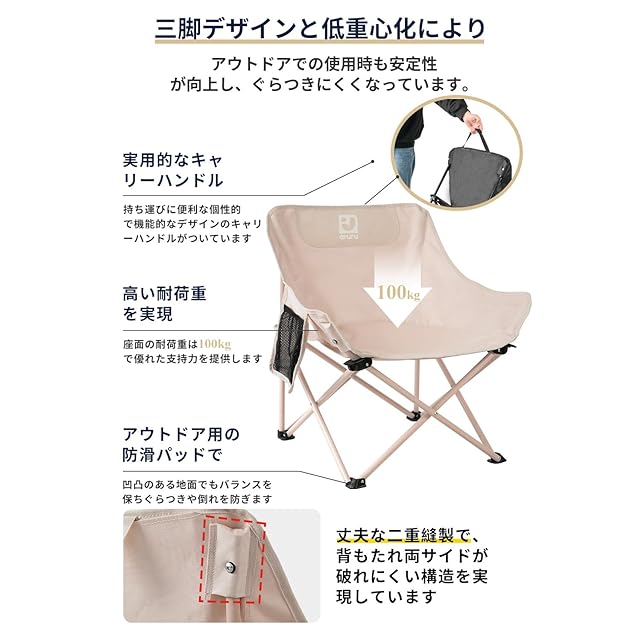 【安定性が高い】 aruru キャンプチェアは三角形のクロスフレーム構造を採用し、耐荷重は100kgです。非常に安定しており、椅子が倒れたり壊れたりする心配はありません。