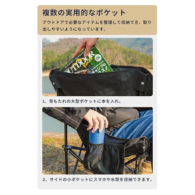 【軽量で持ち運びやすい】キャンプチェアの自重は2.74kgと軽量。簡単に折り畳みできるアウトドア用ローチェアです。付属の収納バッグに入れて車のトランクやリュックに入れて持ち運びでき、いつでもどこでもアウトドアを楽しめます。