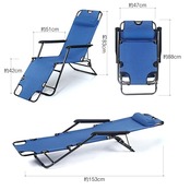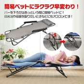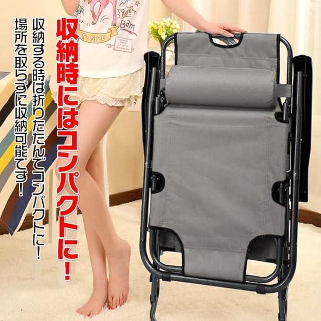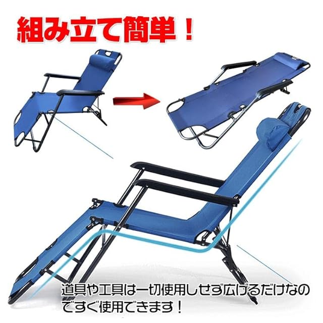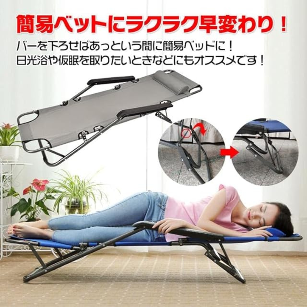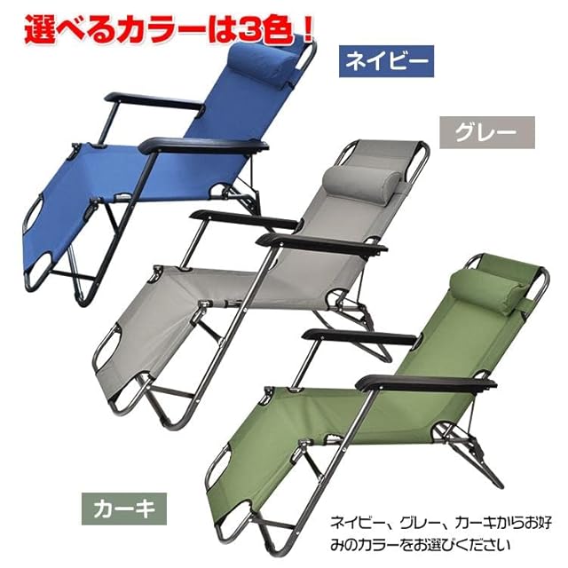 ■折り畳めてラクラク持ち運び可能!<br>■ヘッドレスト付きでリラックスタイムをより快適に!<br>■道具や工具は一切使用しない簡単組み立て!<br>■アウトドア・ホームパーティー・バーベキューetc・・・<br> 色んな場面で活躍間違いなし!<br>■簡易ベットにラクラク早変わり!<br>■収納する時は折りたたんでコンパクト!<br>■選べるカラーは3色!<br><br>【商品内容】:アウトドアチェア<br>【チェアサイズ】:(約)42cm×51cm×83cm×47cm<br>【ベッドサイズ】:(約)153cm×47cm<br>【収納サイズ】:(約)88cm×47cm<br>【カラー】:ネイビー/グレー/カーキ<br>【総重量】:(約)4.7kg<br>【素材】:ポリエステル/金属<br>【耐荷重】:100kg<br><br>○使用上の注意事項○<br>※改造/本来の目的以外/強い衝撃などはお控え下さい。<br>※仕様は改善の為に予告なく変更する場合があります。<br>※ディスプレイ画面等の環境上、写真と実際の商品の色とは多少違う場合がございます。<br>※海外輸入商品により、軽い汚れ/ダメージ等がついている場合がございます。<br><br>○以上、ご同意の上ご購入ください!○